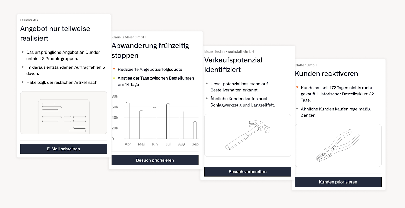 Im Gegensatz zu generischen KI-Lösungen ist unsere Vertriebsintelligenz darauf trainiert, die spezifischen Muster in heterogenen Produktportfolios und dem B2B-Kaufverhalten zu erkennen.