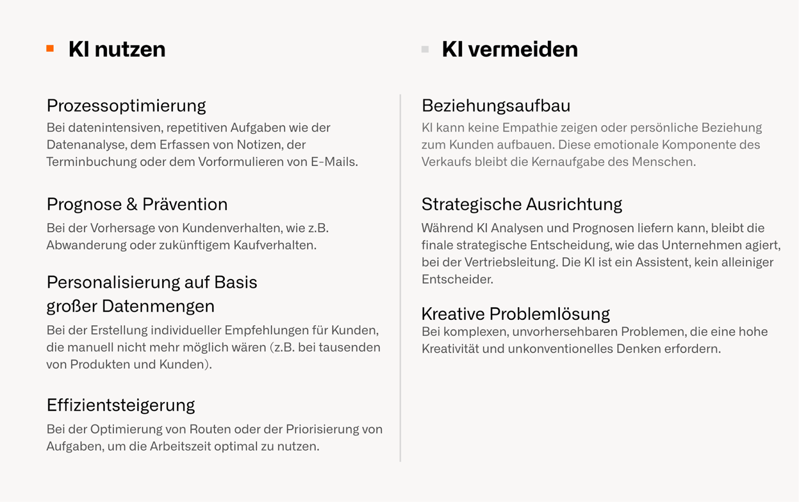 - Strategische Ausrichtung: Während KI Analysen und Prognosen liefern kann, bleibt die finale strategische Entscheidung, wie das Unternehmen agiert, bei der Vertriebsleitung. Die KI ist ein Assistent, kein alleiniger Entscheider.